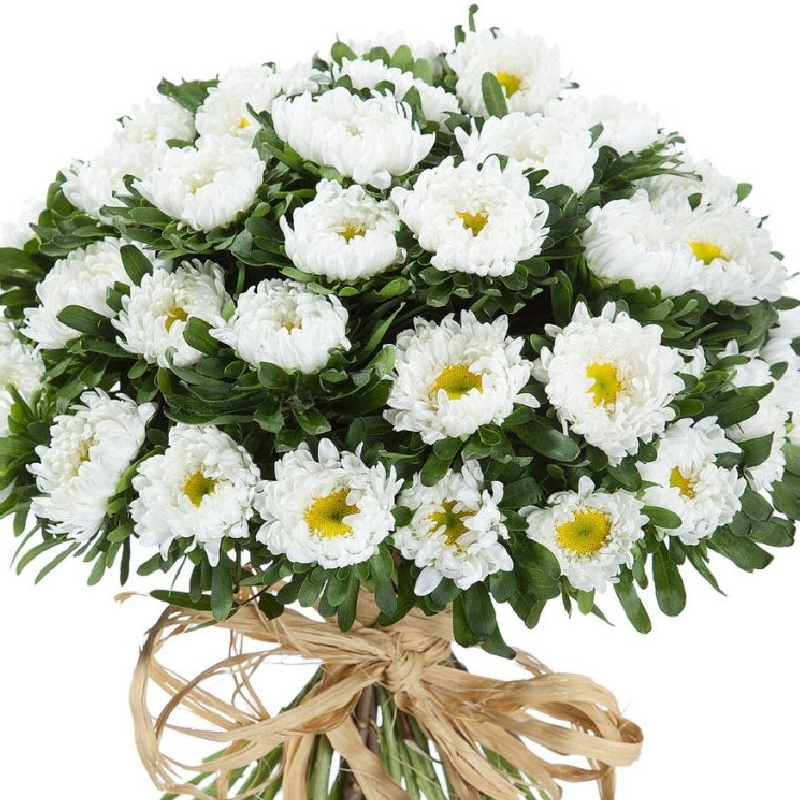 Букет состоит из 51 белая астра, прозрачная упаковка, лента.