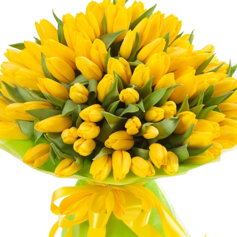 Букет состоит из 101 желтый тюльпан, красивая упаковка, атласная лента.