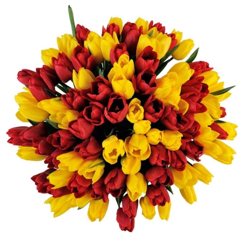 Букет состоит из 51 красный тюльпан, 50 желтых тюльпанов, прозрачная упаковка, атласная лента.