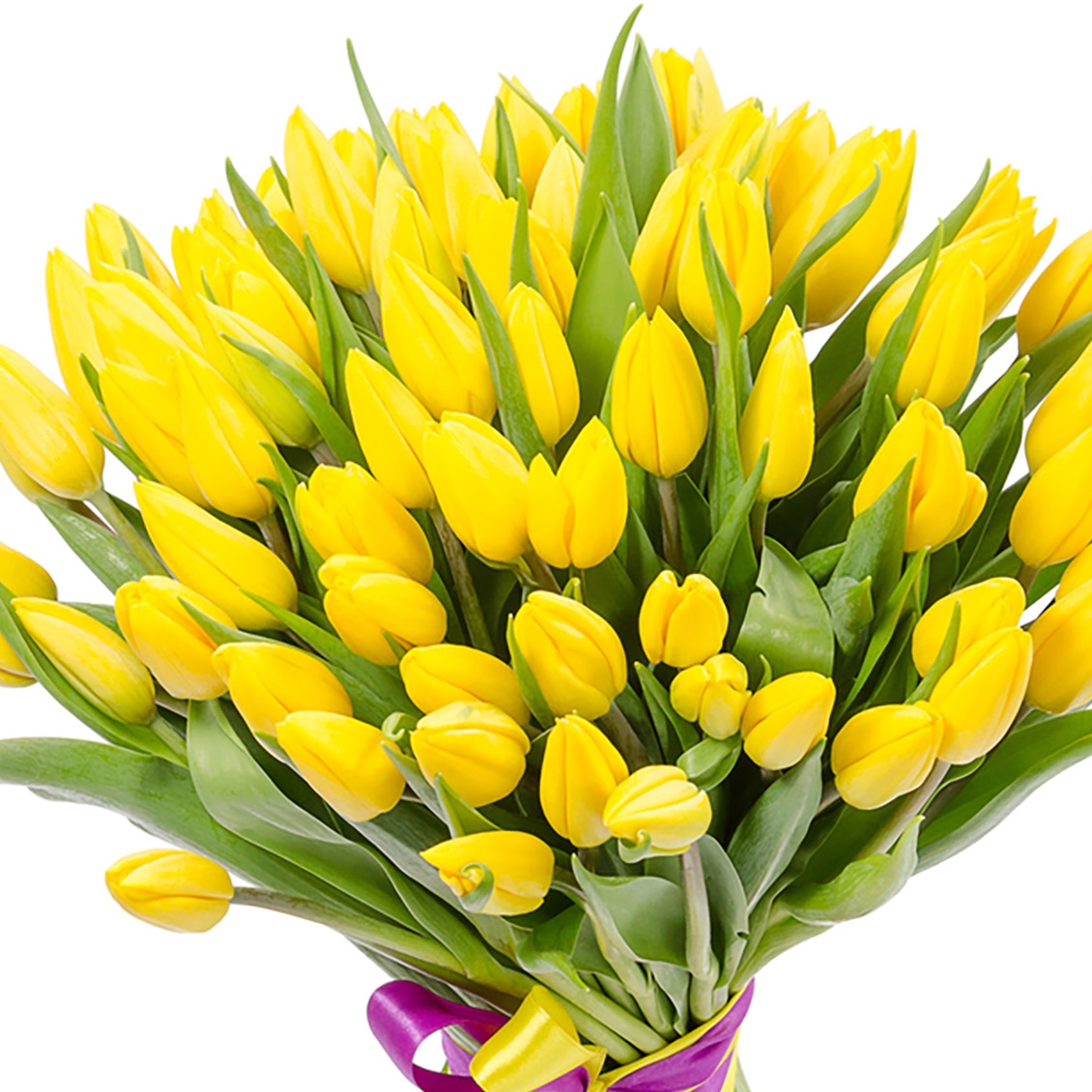 Букет состоит из 101 желтый тюльпан, прозрачная упаковка, желтая лента.