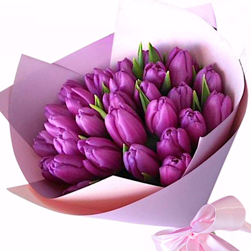 Букет состоит из 25 сиреневых тюльпанов, красивая упаковка, атласная лента.