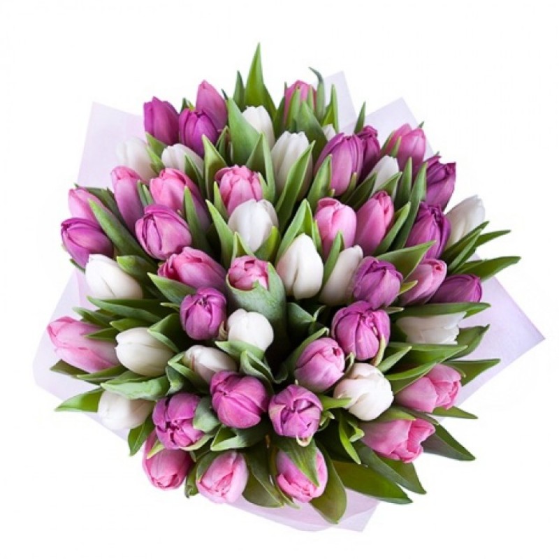 Букет состоит из MIX из 51 сиреневого и белого тюльпана, розовая упаковка, атласная лента.