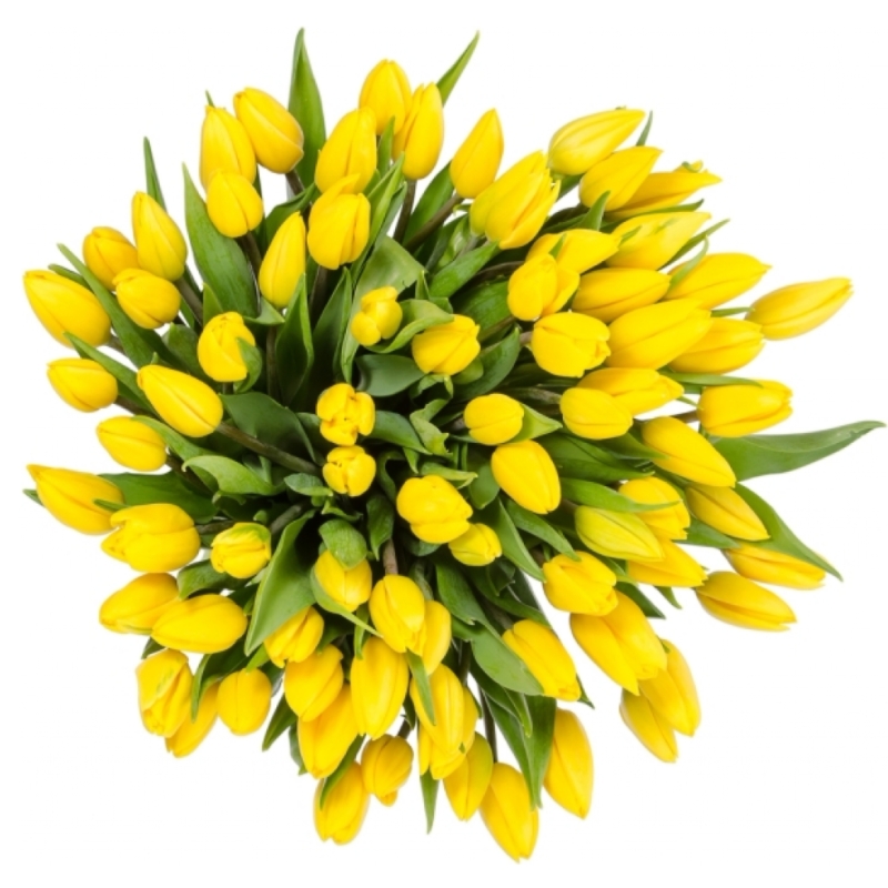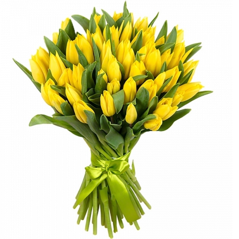 Букет состоит из 51 желтый тюльпан, атласная лента.