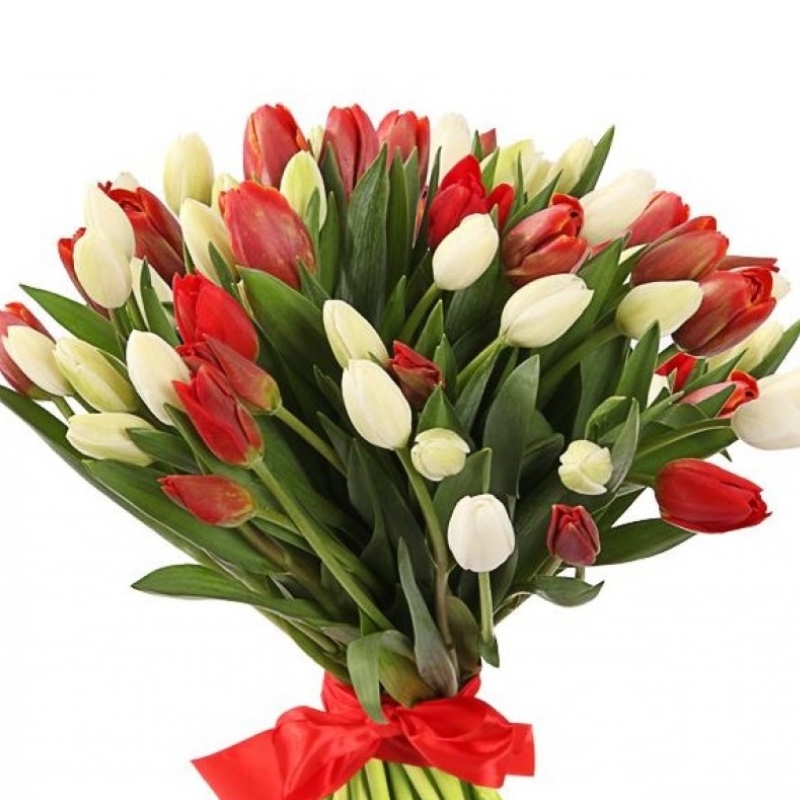 Букет состоит из 26 красных тюльпанов, 25 белых тюльпанов, атласная лента.
