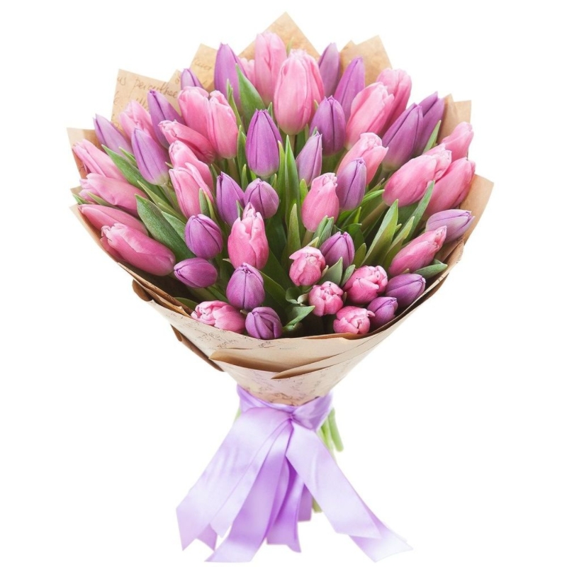 Букет состоит из 26 сиреневых тюльпанов, 25 розовых тюльпанов, красивая упаковка, атласная лента.