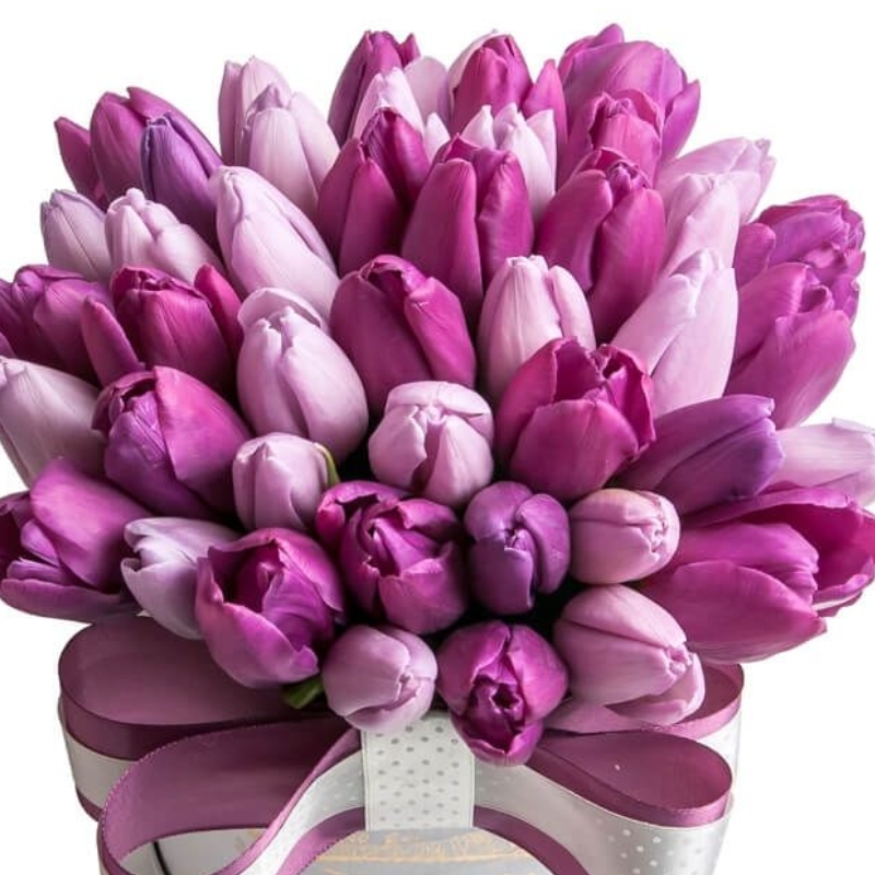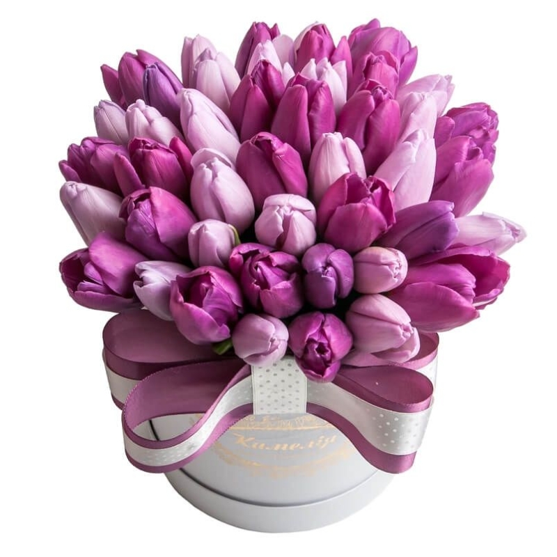 Букет состоит из 51 сиреневый тюльпан, коробка, атласная лента, оазис.