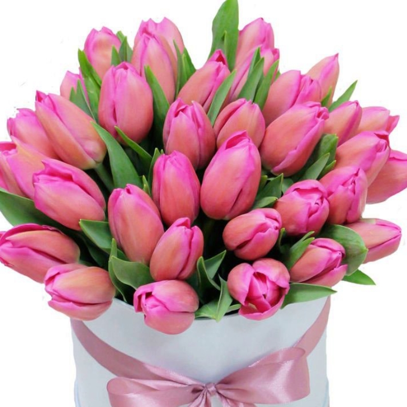 51 розовый тюльпан, коробка, розовая лента.
