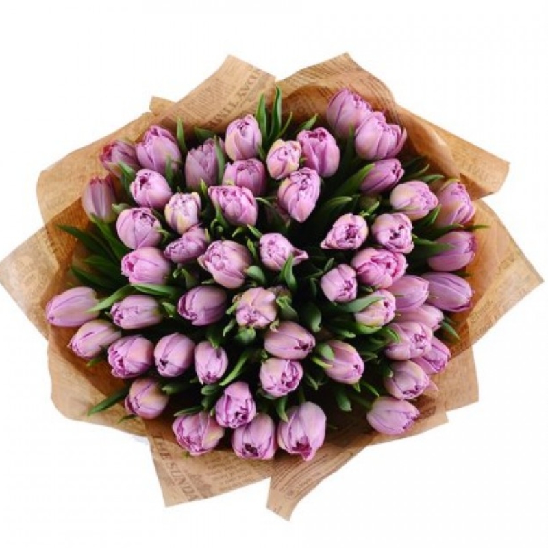 Букет состоит из 51 сиреневый тюльпан, крафт, атласная лента.