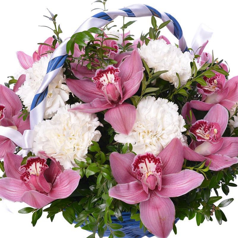 Букет состоит из 11 орхидей, 8 гвоздик, зелень, корзина, оазис.