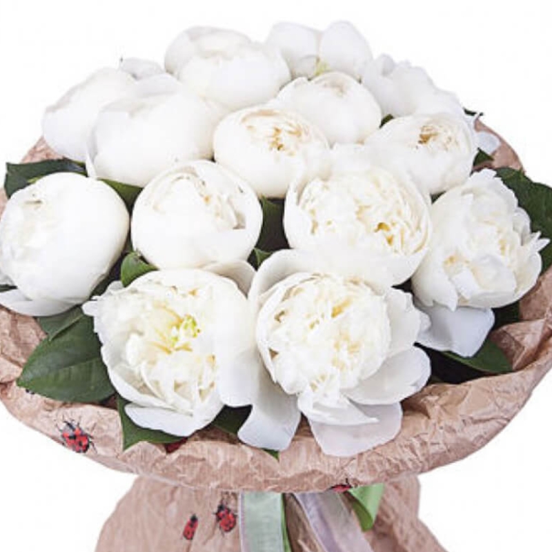 Букет состоит из 15 белых пионов, крафт, атласная лента.