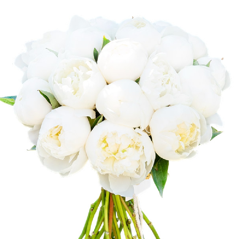 Букет состоит из 21 белый пион, прозрачная упаковка, атласная лента.