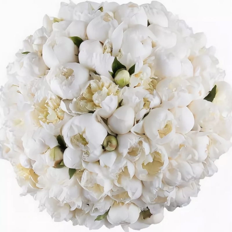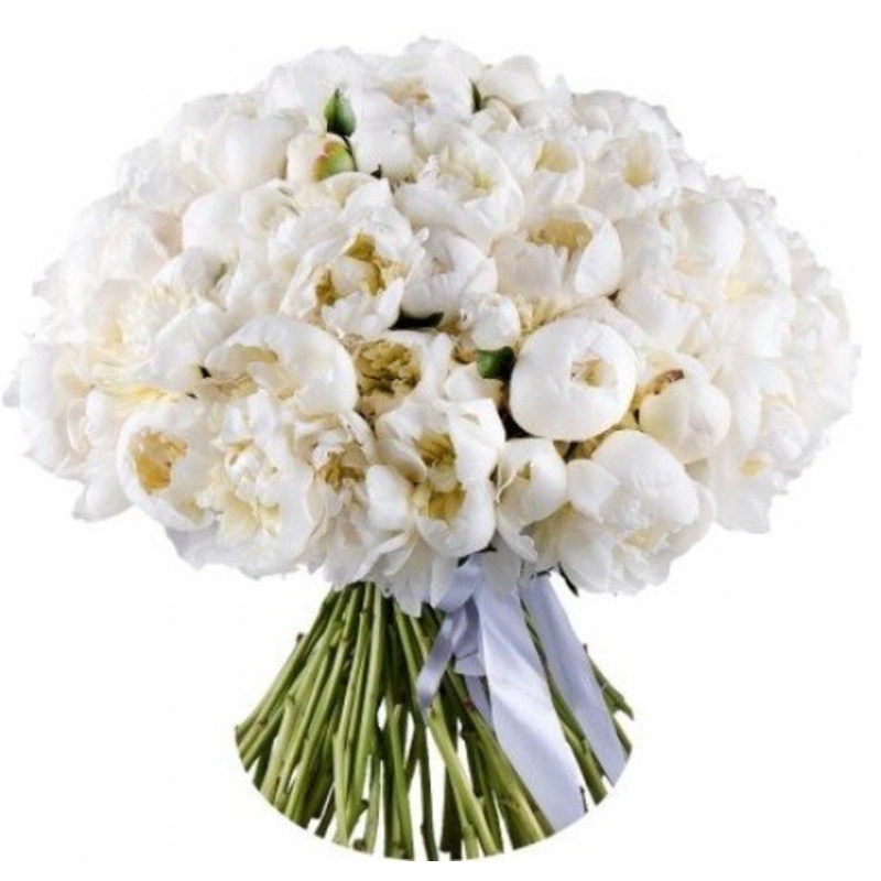 Букет состоит из 101 белый пион, прозрачная упаковка, атласная лента.