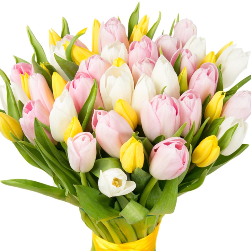 Букет состоит из MIX из 45 белых /желтых и розовых тюльпанов, прозрачная упаковка, атласная лента.