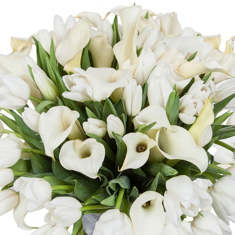 Букет состоит из 15 белых калл, 40 белых тюльпанов, прозрачная упаковка, атласная лента.