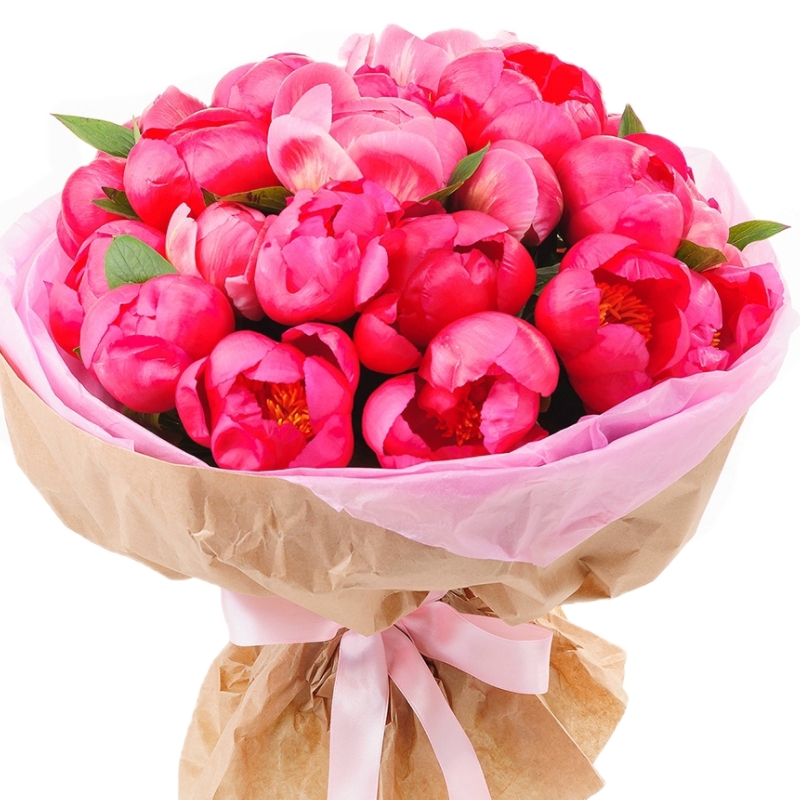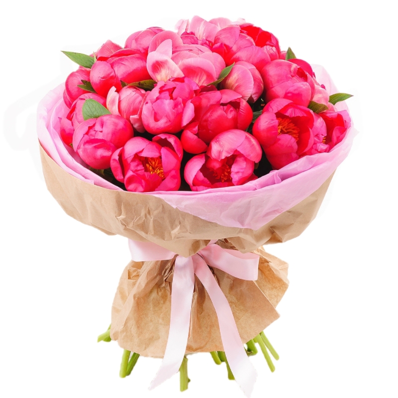 Букет состоит из 23 пиона, крафт, атласная лента.
