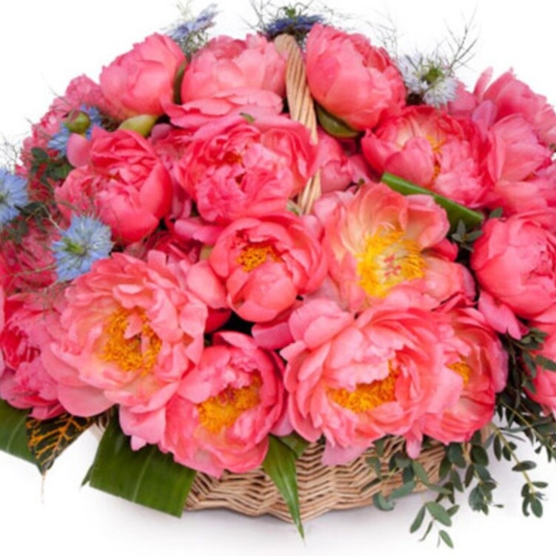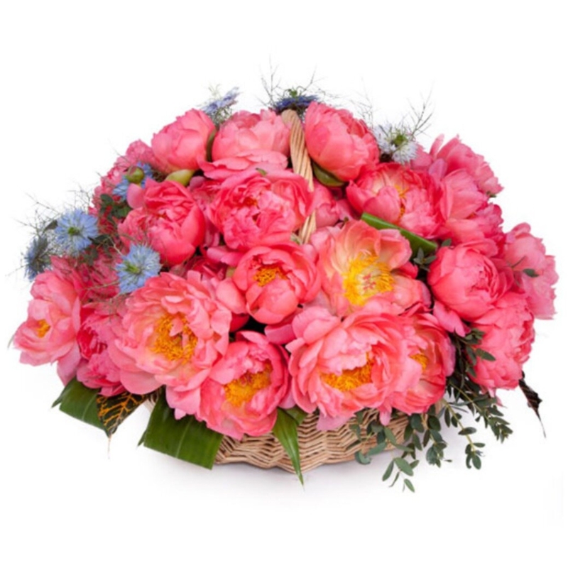 31 пион, 7 цветков нигеллы, аспидистра, зелень, корзина, оазис.