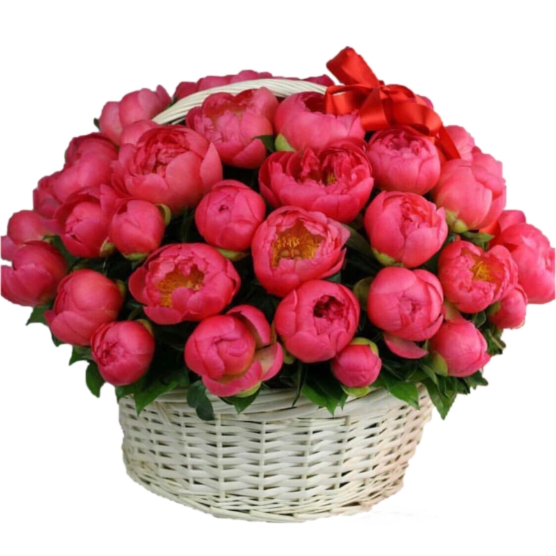 Букет состоит из 51 красный пион, зелень, корзина, оазис.