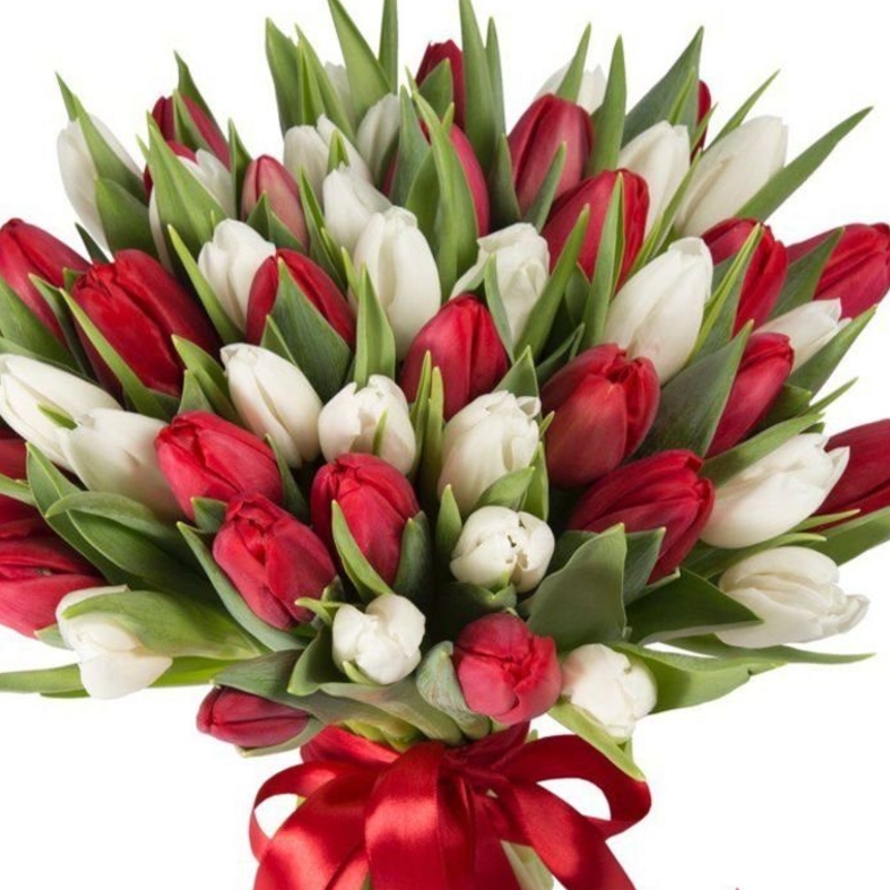 Букет состоит из 23 красных тюльпана, 22 белых тюльпана, прозрачная упаковка, атласная лента.