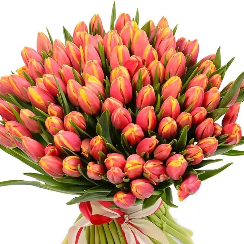 Букет состоит из 75 голландских тюльпанов, прозрачная упаковка, атласная лента.