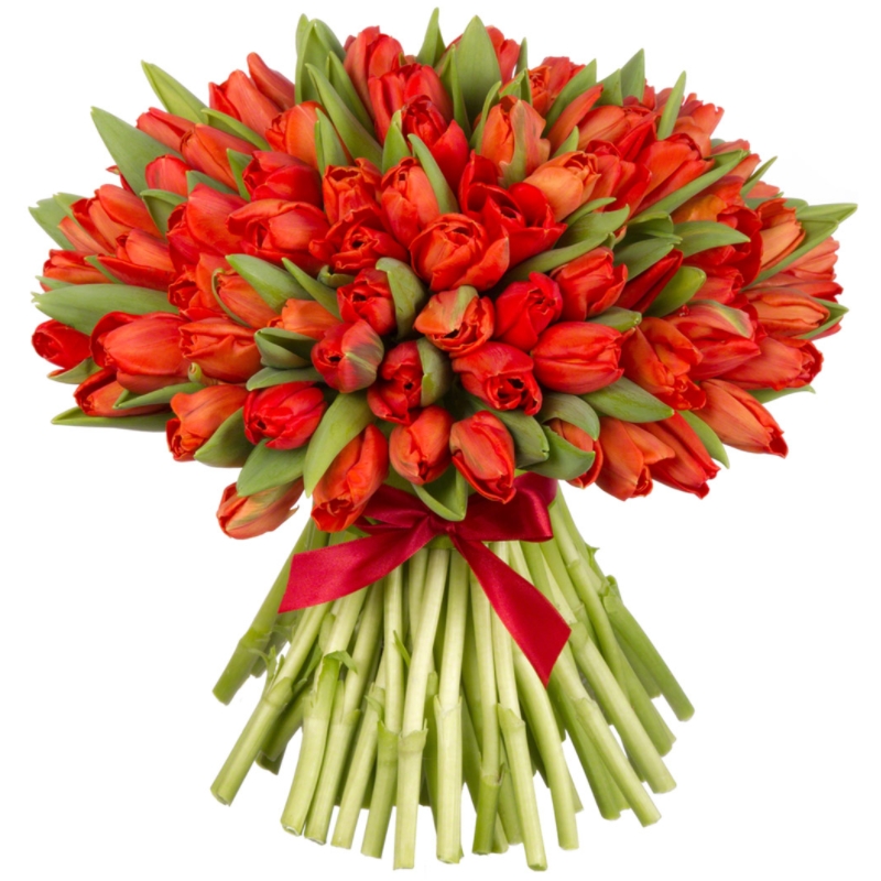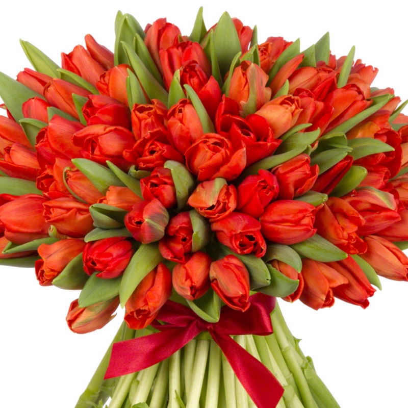 Букет состоит из 75 красных тюльпанов, прозрачная упаковка, атласная лента.