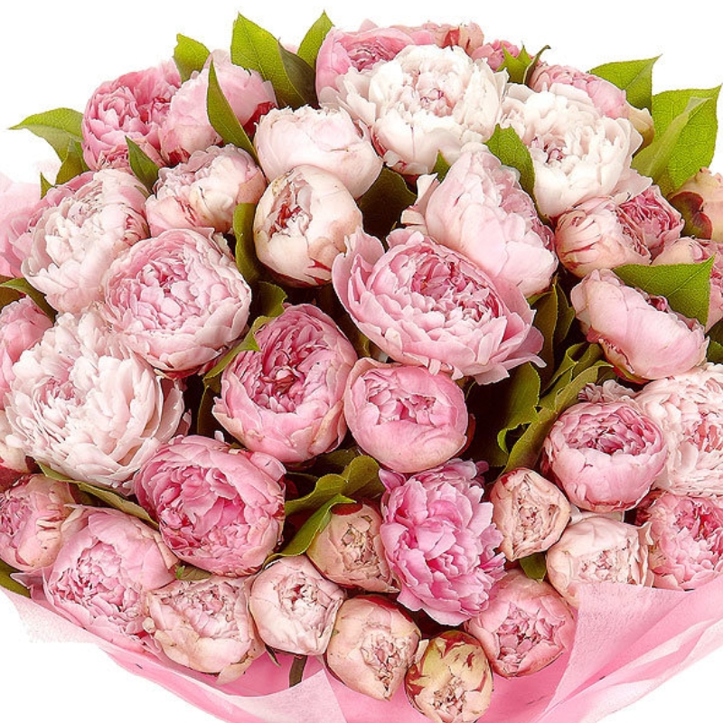 Букет состоит из 45 розовых пионов, зелень, красивая упаковка, атласная лента.