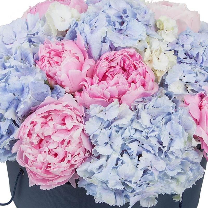 Букет состоит из 7 пионов, 6 гортензий, коробка, оазис.