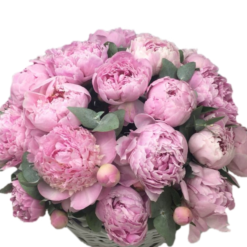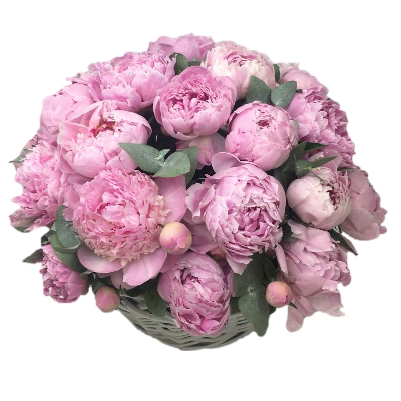 Букет состоит из 25 розовых пионов, зелень, корзина, оазис.