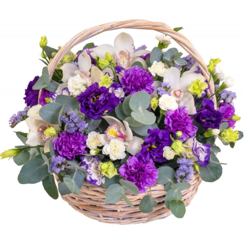 Букет состоит из 15 гвоздик, 6 веток эустомы, 5 орхидей, 3 ветки статицы, корзина, оазис.