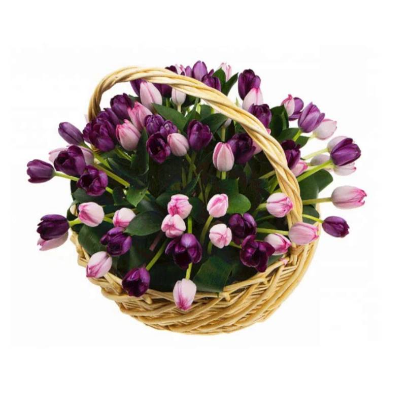 38 сиреневых тюльпанов, 37 розовых тюльпанов, корзина.