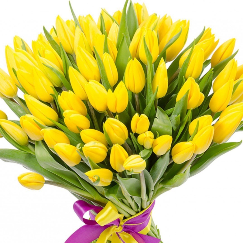 Букет состоит из 75 желтых тюльпанов, прозрачная упаковка, атласная лента.
