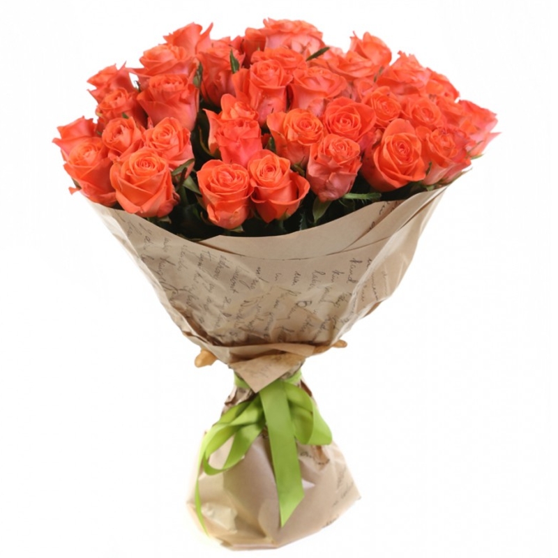 Букет состоит из 31 коралловая роза, крафт, атласная лента.