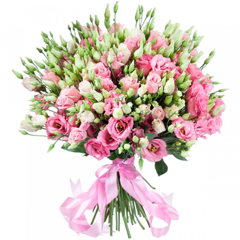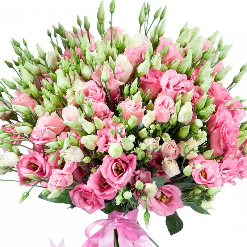 Букет состоит из 51 ветка розовой и белой эустомы, прозрачная упаковка, атласная лента.