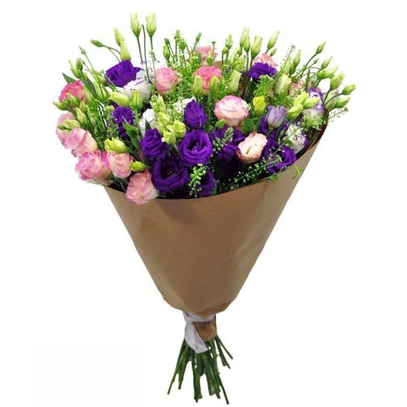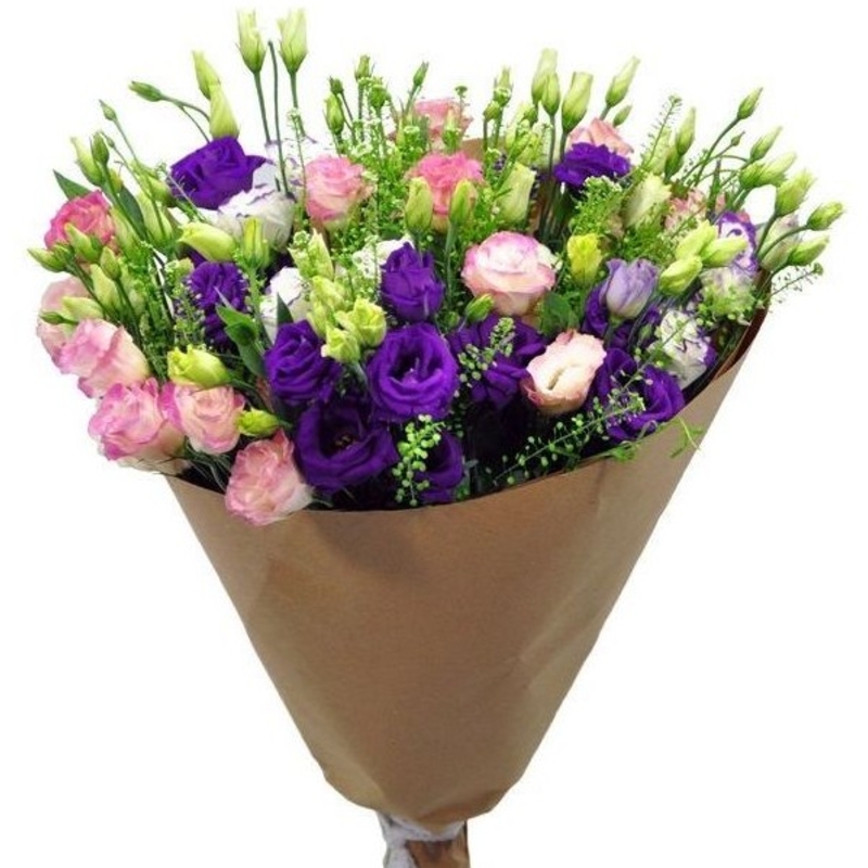 Букет состоит из 21 ветка разноцветной эустомы, зелень, крафт, атласная лента.