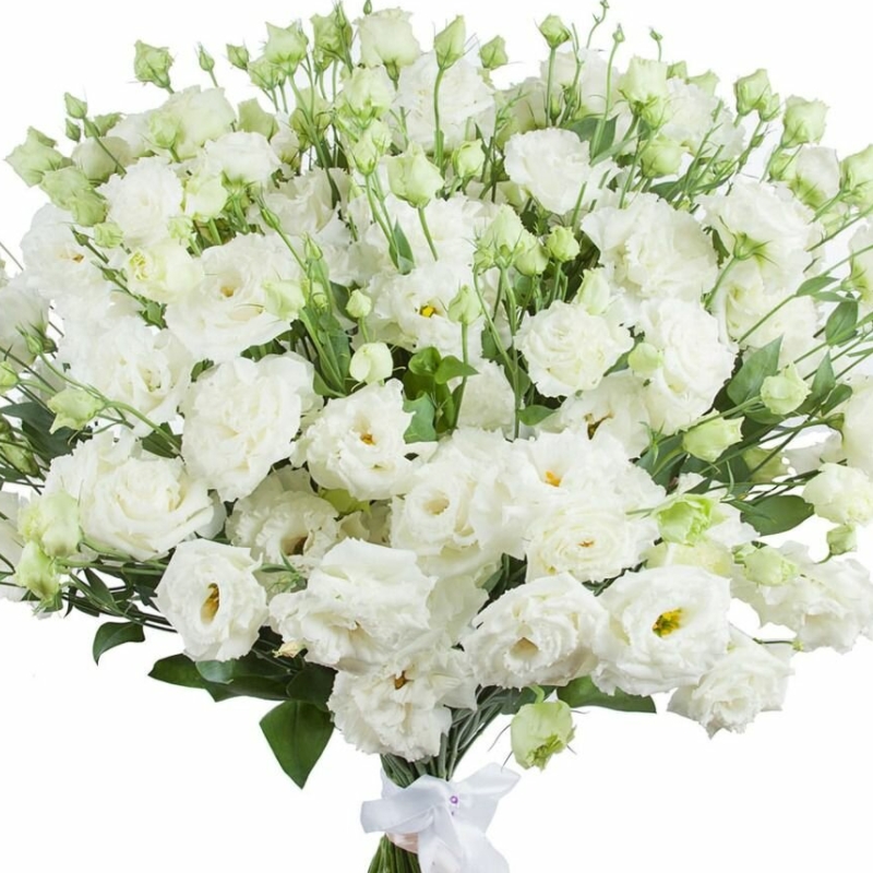 Букет состоит из 25 веток белой эустомы, прозрачная упаковка, атласная лента.