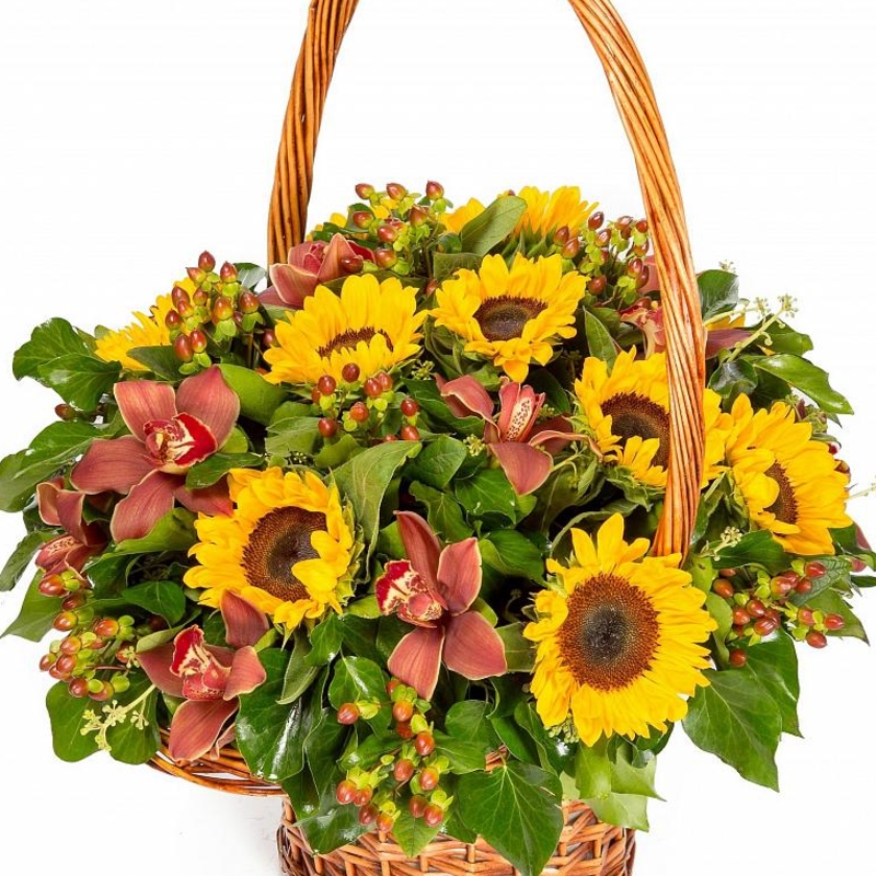 Букет состоит из 11 подсолнухов, 11 орхидей, 11 веток гиперикума, зелень, корзина, оазис.