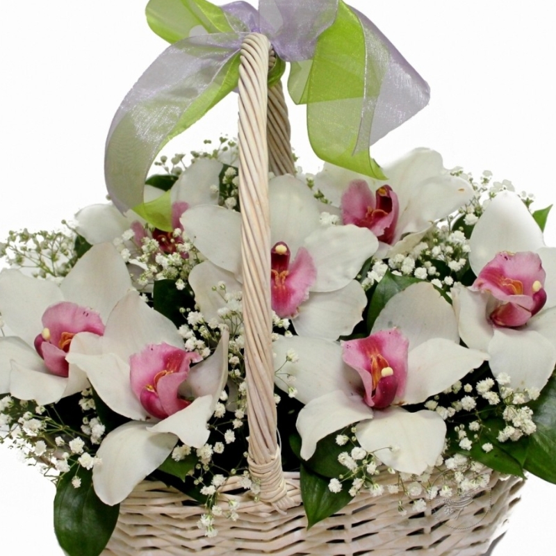 Букет состоит из 7 орхидей, 5 гипсофила, зелень, корзина, оазис.