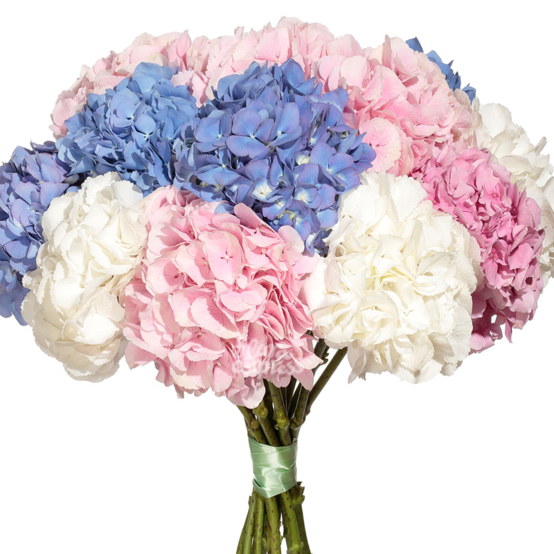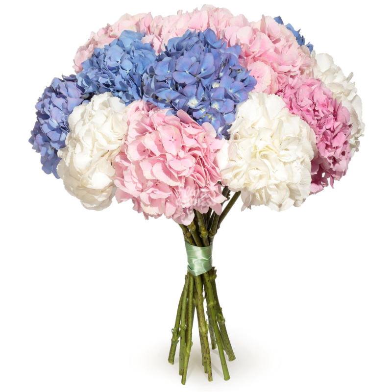 Букет состоит из MIX из 15 гортензий, прозрачная упаковка, атласная лента.