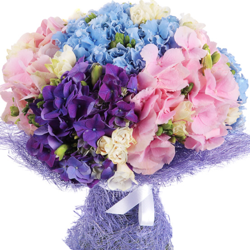Букет состоит из 7 разноцветных гортензий, 4 ветки эустомы, красивая упаковка, атласная лента.