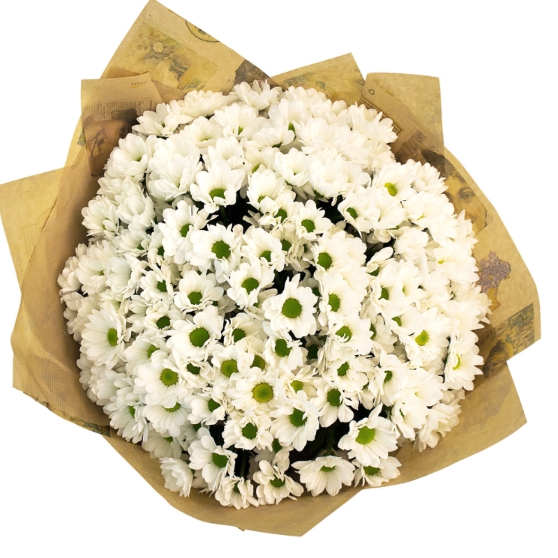 Букет состоит из 25 веток белой ромашковой хризантемы, крафт, атласная лента.