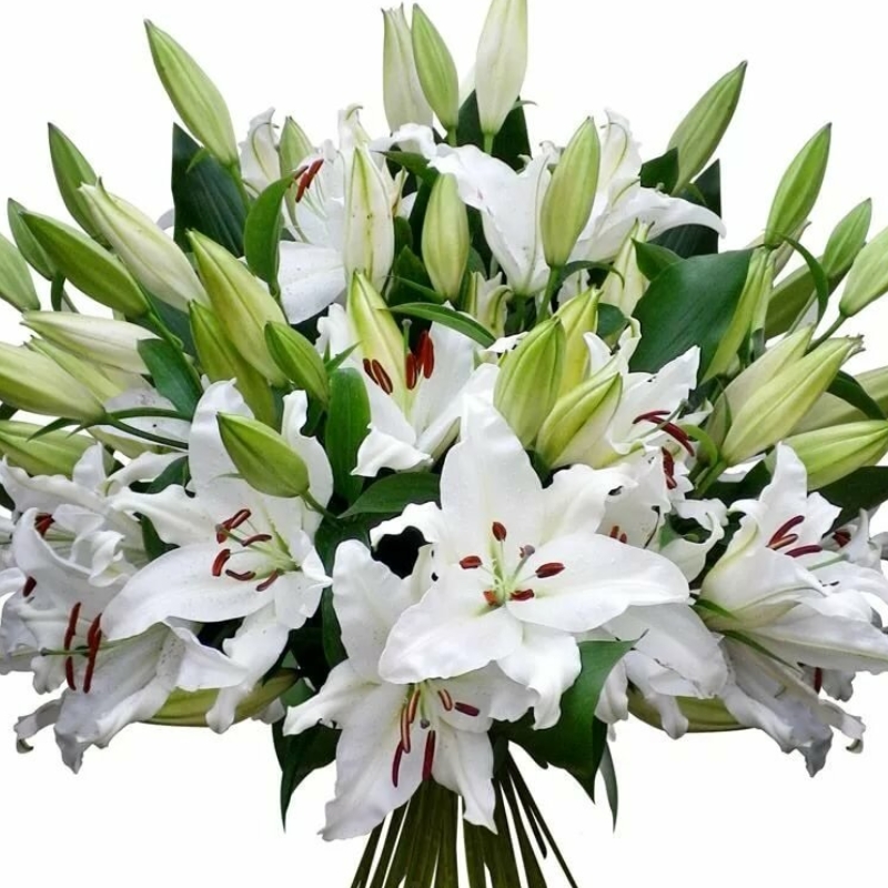 Букет состоит из 15 белых лилий, прозрачная упаковка, атласная лента.
