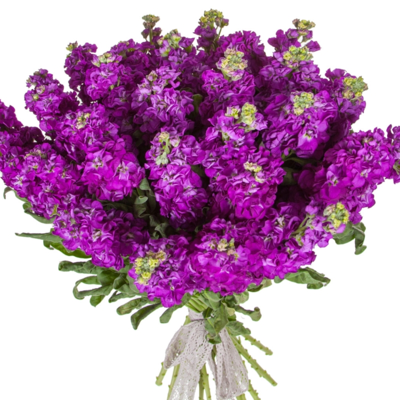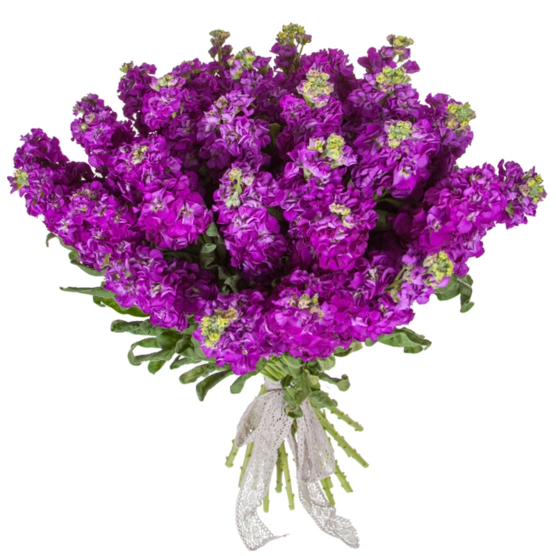 Букет состоит из 31 фиолетовая маттиола, прозрачная упаковка, атласная лента.
