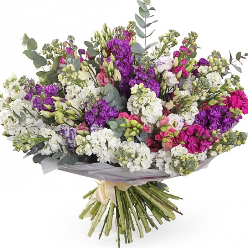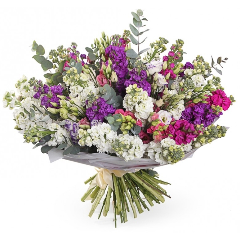 Букет состоит из MIX из 27 маттиол, 8 веток эустомы, эвкалипт, упаковка, лента.