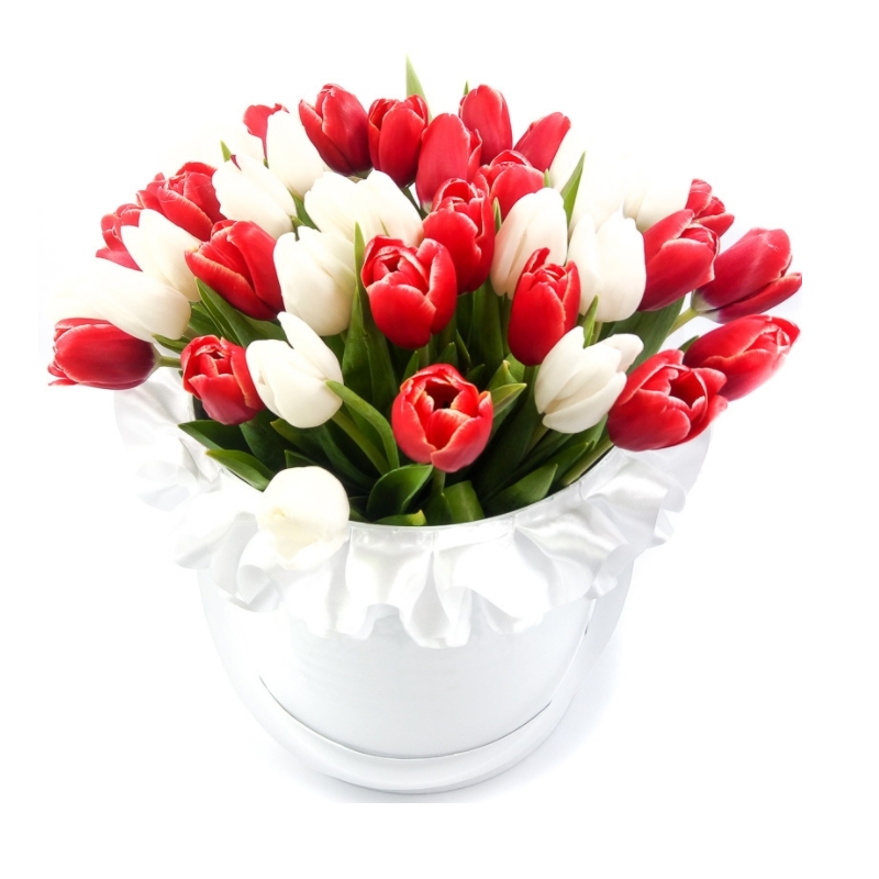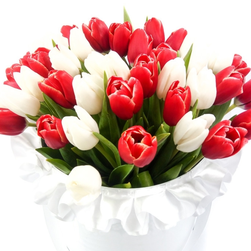 Букет состоит из 26 красных тюльпанов, 25 белых тюльпанов, белая коробка, красная лента.