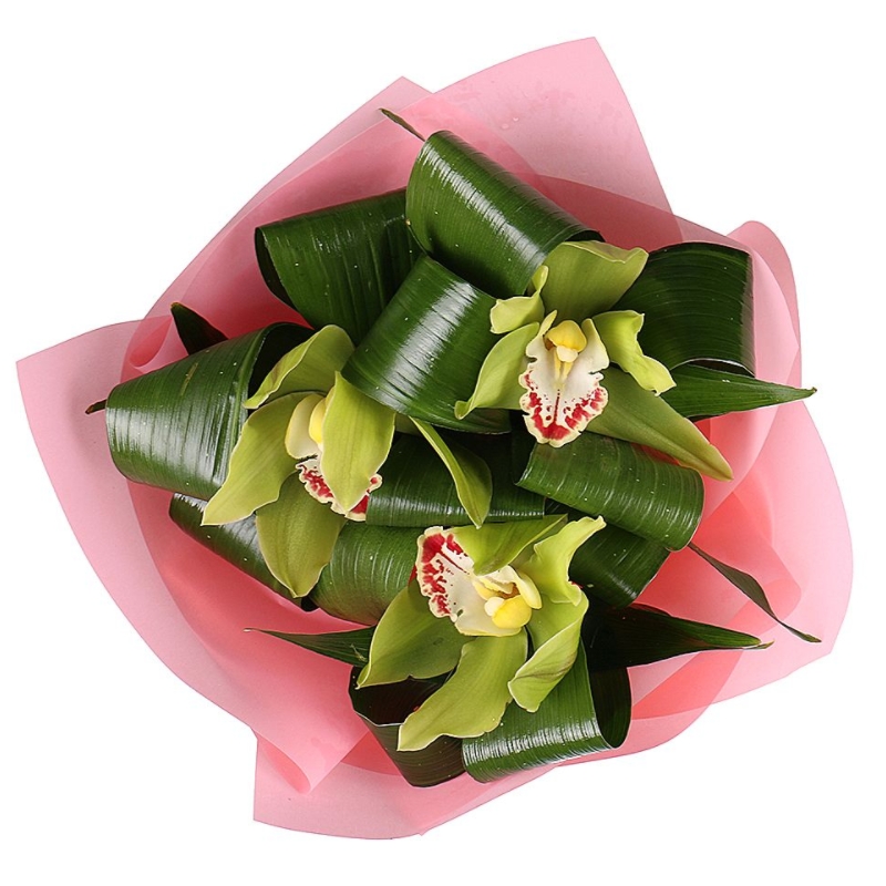 Букет состоит из 3 орхидеи, аспидистра, красивая упаковка, атласная лента.