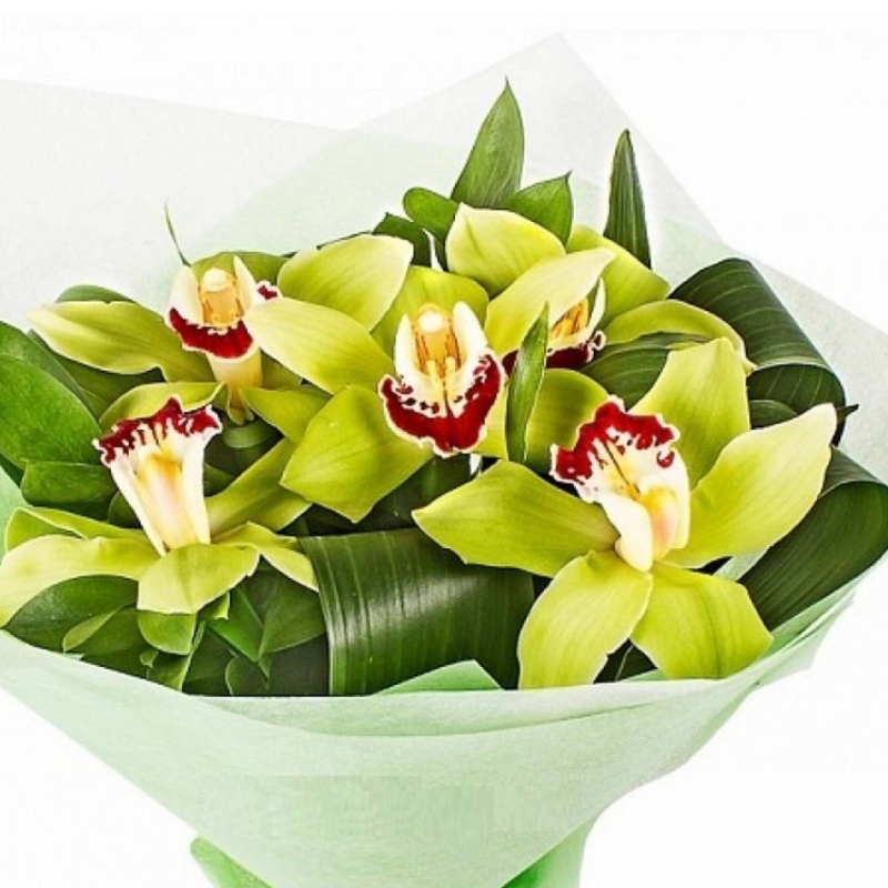 Букет состоит из 5 орхидей, красивая упаковка, атласная лента.