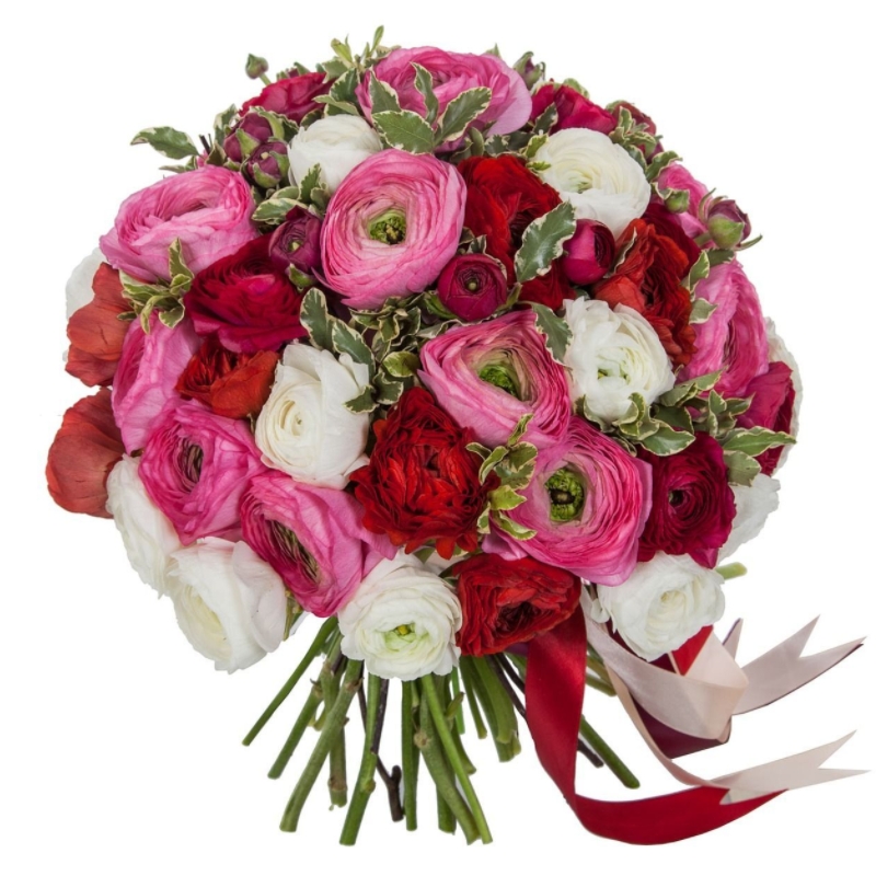 Букет состоит из MIX из 51 ранункулюса, зелень, прозрачная упаковка, атласная лента.