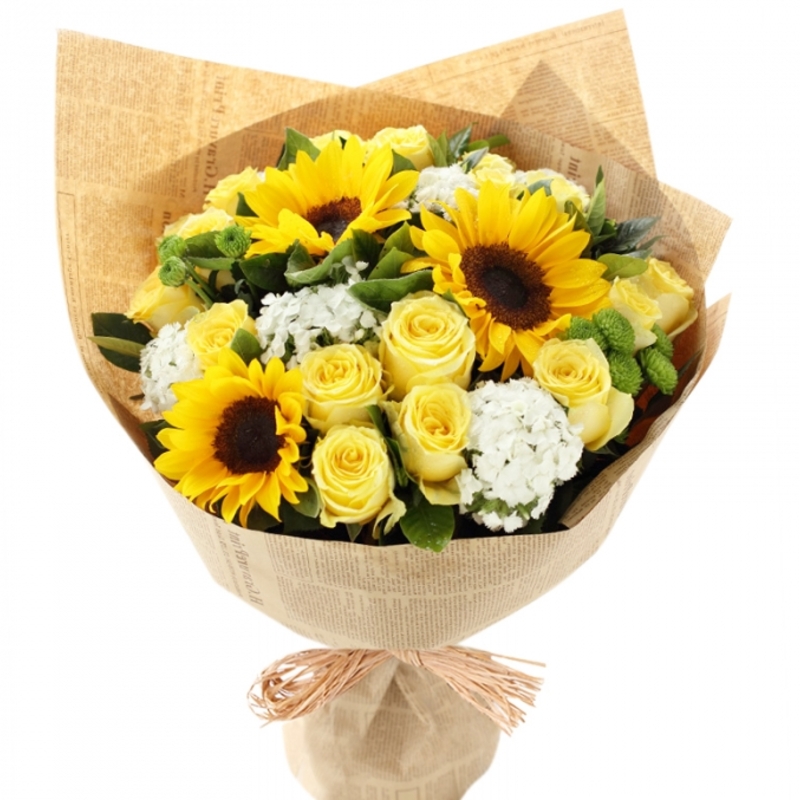 Букет состоит из 14 роз, 3 подсолнуха, 4 ветки маттиолы, 2 ветки хризантемы, зелень, крафт, атласная лента.