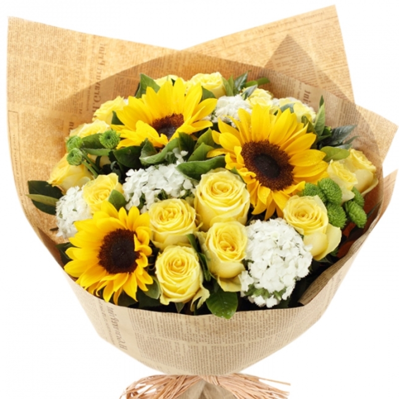 Маттиола 4 шт., Подсолнух 3 шт., Роза 14 шт., Хризантема 2 шт. |