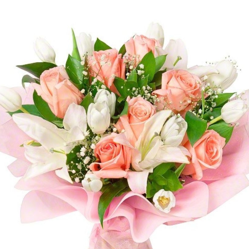Букет состоит из 7 розовых роз, 2 белых лилии, 11 тюльпанов, 3 гипсофила, зелень, красивая упаковка, атласная лента.