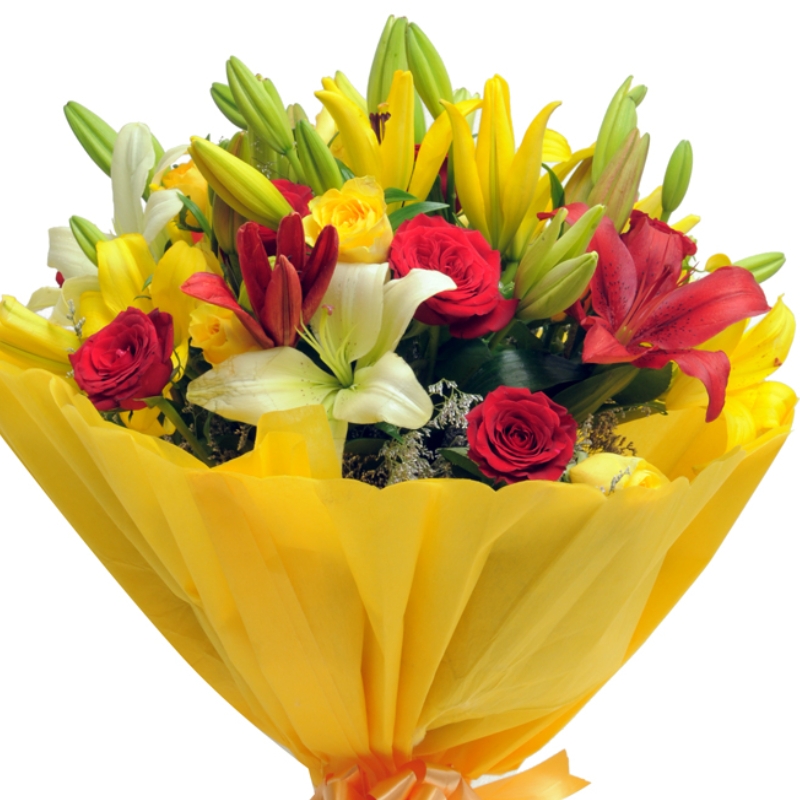 Букет состоит из 5 красных роз, 5 желтых роз, 2 ветки белой лилии, 4 ветки желтой лилии, зелень, красивая упаковка, атласная лента.